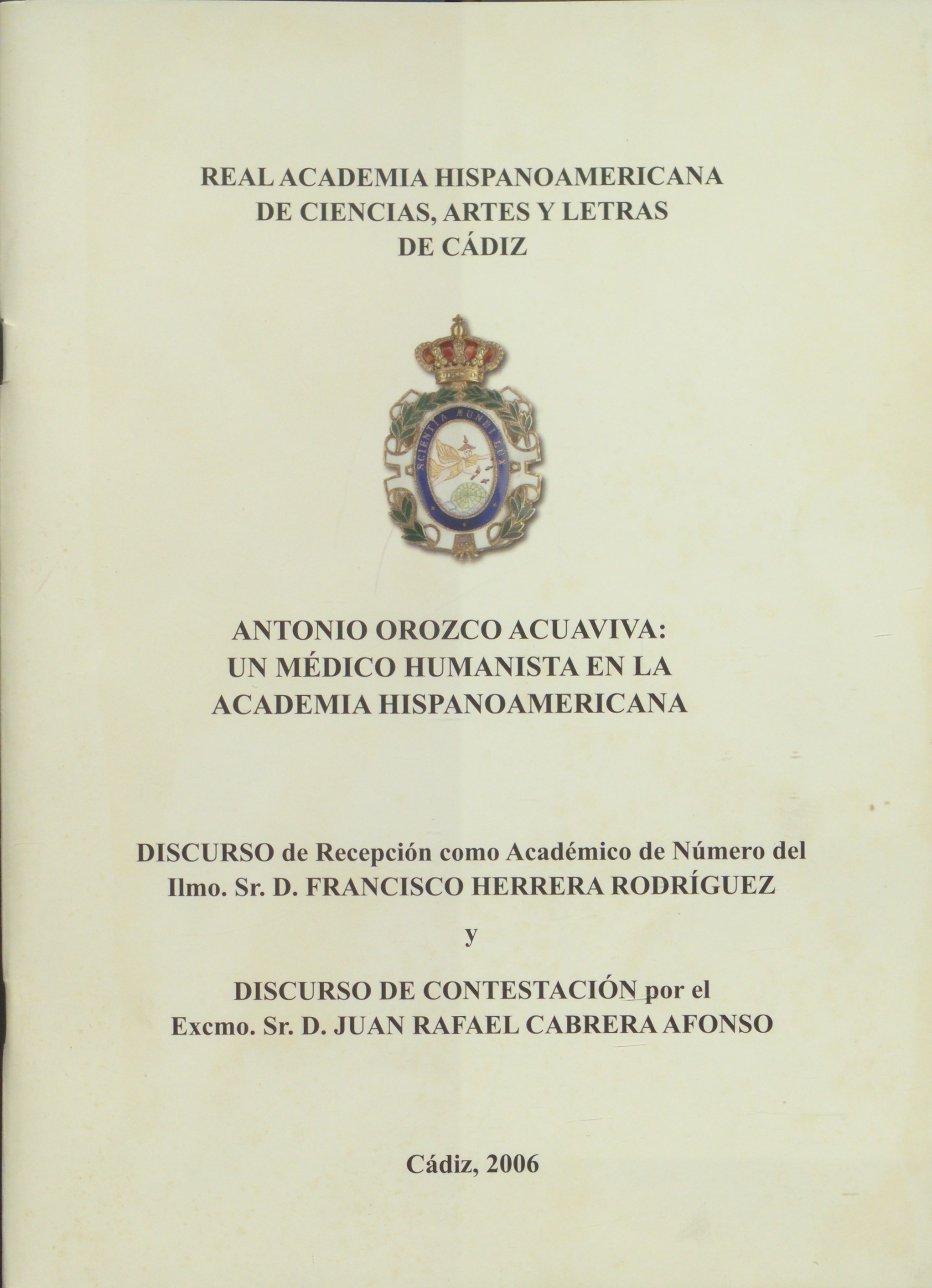 Discurso de recepción como Académico de Número de la Real Academia Hispanoamericana de Ciencias, Artes y Letras de Cádiz y discurso de contestación por Juan Rafael Cabrera.